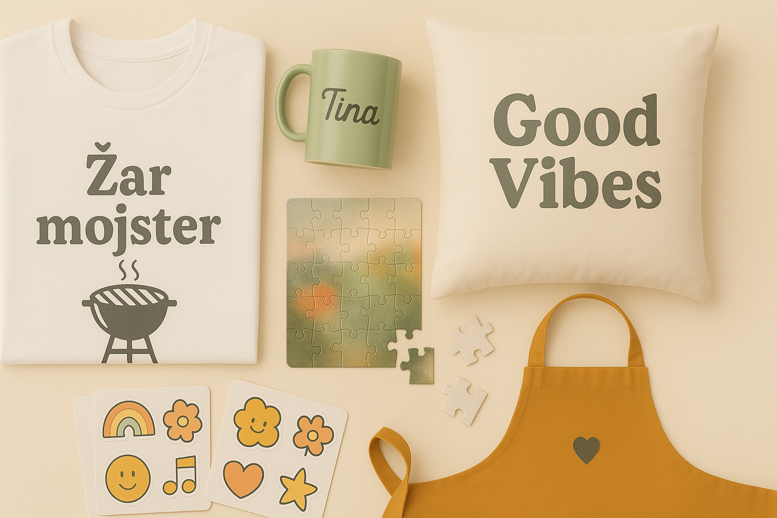 Pri nas lahko ustvariš popolnoma unikaten izdelek – tak, kot si ga zamisliš. Izberi osnovni izdelek, naloži svojo sliko ali grafiko, dodaj posebna navodila in mi bomo poskrbeli za vse ostalo. Ne glede na to, ali gre za osebno darilo, presenečenje za prijatelja ali promocijski artikel za podjetje – tiskamo majice, šalčke, blazine, nalepke, predpasnike in še več.